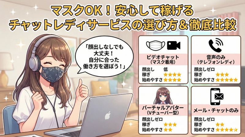 顔出しへの抵抗が強い方は、まずテレフォンレディやメールレディから始めて、チャットレディの仕組みや稼ぎ方に慣れてからビデオチャット(マスク着用)に移行する方法もおすすめです。