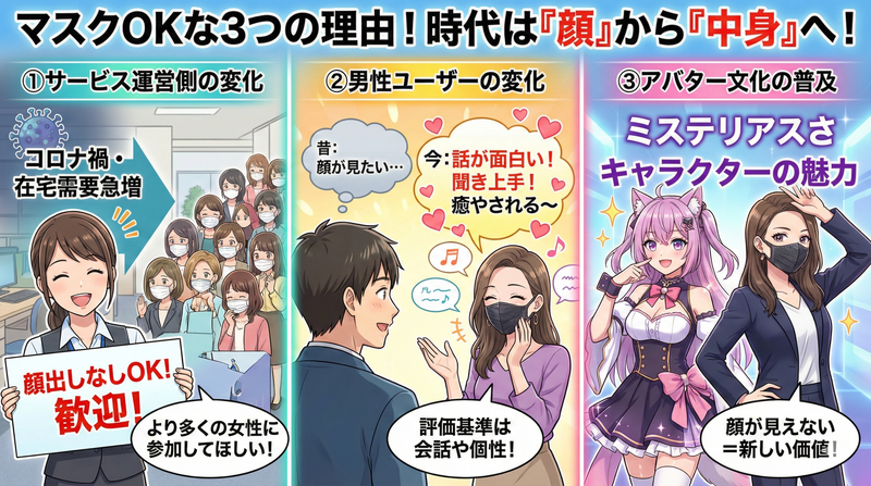 しかし、新型コロナウイルスの流行をきっかけに在宅ワーク・副業への需要が急増し、サービス各社が「より多くの女性に参加してもらう」ため、顔出しなし・マスク着用を公式に認めるようになりました。