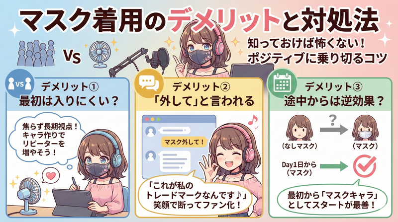 身バレ防止の観点からはバーチャルアバターが最強ですが、設定に時間・技術が必要です。手軽に始めたい方にはマスク着用スタイルが圧倒的におすすめです。まずマスク着用で始め、慣れてきたらアバタースタイルへの移行を検討するのが最も現実的なルートです。