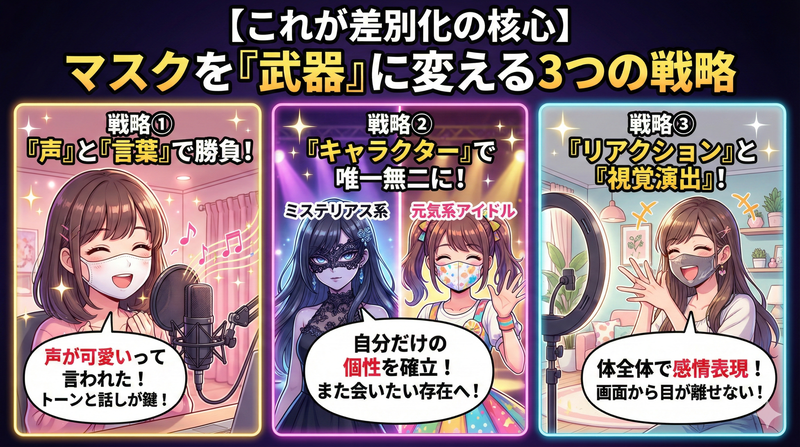 - 声・キャラクター・視覚演出の3戦略でマスクを武器に変えられる