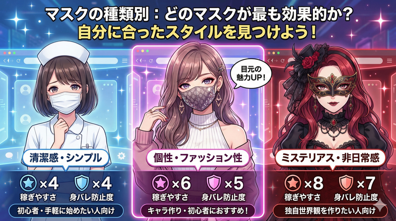 | マスクの種類 | 印象・特徴 | 稼ぎやすさ | 身バレ防止度 | 向いている人 |