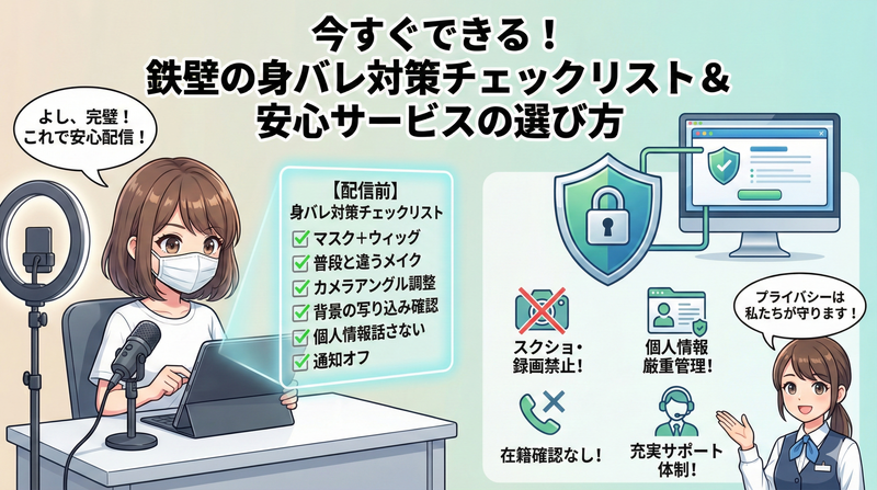 業界全体で「身バレの可能性は極めて低い」と言われています。特にマスク+ウィッグ+カメラアングルの工夫を組み合わせれば、知人に視聴されても別人として認識される確率が高いです。ただし、話す内容(地域・職場・人間関係)や背景に映り込む情報からの特定リスクには注意が必要です。本記事で紹介した身バレ対策チェックリストを毎回実践することをおすすめします。