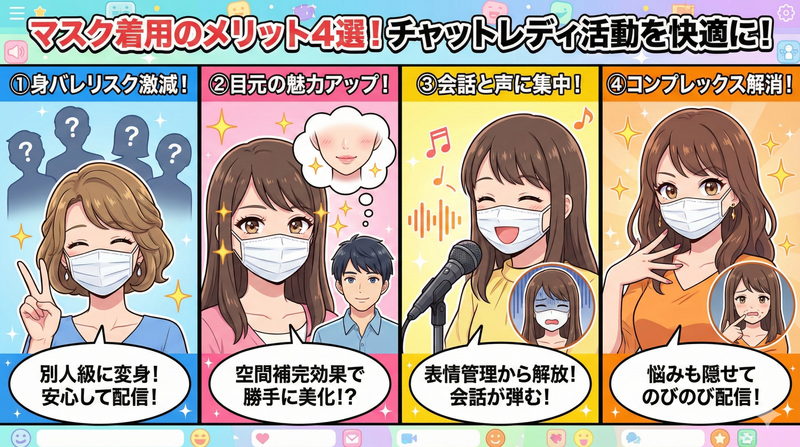 マスクはキャラクターを作るための最高の演出小道具です。「マスクをした〇〇さん」というブランドを作ることで、顔出しのチャットレディとは全く別の土俵で戦えます。