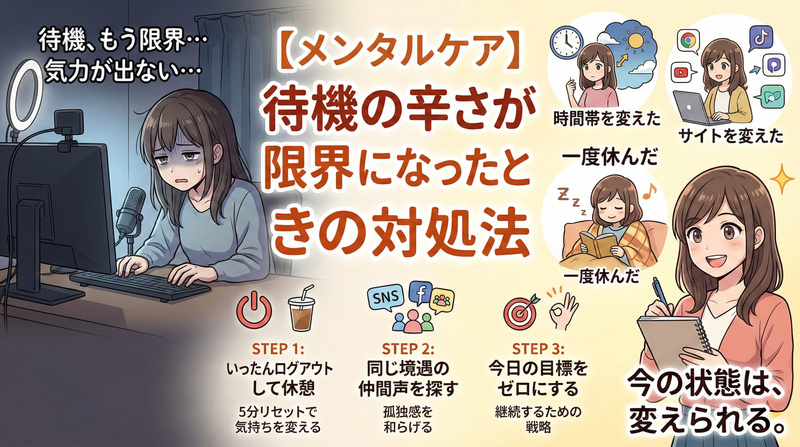 この記事では、チャットレディの待機が辛い理由を正直に解説したうえで、今日から使える待機時間の活用法、メンタルの守り方、そして「続けるか・撤退するか」の判断基準まで、まるごとお伝えします。