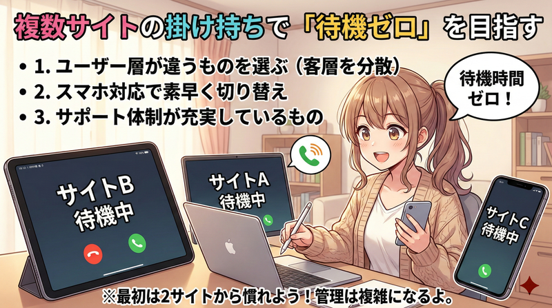 一つのサービスだけに絞っている場合、複数サイトの掛け持ちは待機時間を実質ゼロに近づける最も合理的な方法です。