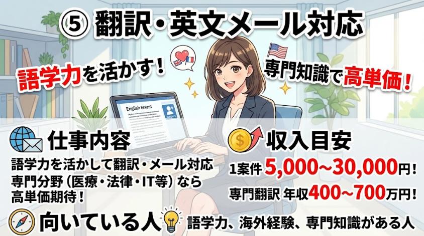 | 収入目安 | 1案件5,000〜30,000円/専門翻訳なら年収400〜700万円も |